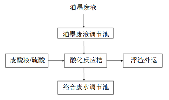 油墨廢液的主要成份為含羥基的樹脂在堿性條件下所生成的有機酸鹽,而這些含羥基的樹脂不易溶于酸性溶液中。應用這一基本性質,在處理顯影、脫膜廢液時可采取以廢治廢的方法,利用生產車間排出的廢酸液對油墨廢液中進行酸化處理,不足時可投加硫酸溶液。