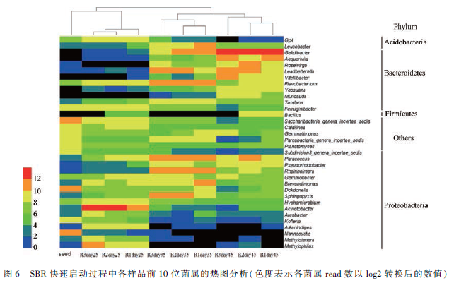 對(duì)SBR 中活性污泥進(jìn)行了高通量測(cè)序用于揭示反應(yīng)器菌群結(jié)構(gòu)演替以及復(fù)合菌劑的存留狀況。群落結(jié)構(gòu)分析的4 組實(shí)驗(yàn)包括配入高鹽廢水前期(R1、R2 和R3 完成接種后在相同條件下運(yùn)行,樣品編號(hào)Rday15),連續(xù)投加復(fù)合菌劑的R1 組(樣品編號(hào)R1 day25、R1 day35、R1 day45),連續(xù)投加復(fù)合菌劑的固定化填料的R2 組(樣品編號(hào)R2 day25、R2 day35、R2 day45);連續(xù)投加活性污泥的R3 組(樣品編號(hào)R3day25、R3 day35、R3 day45)。不同處理組及采樣階段,菌門水平變化如圖5 所示。活性污泥微生物中含量較多的為變形菌門( Proteobacteri) 和擬桿菌門( Bacteroidetes),其所占比例較高,分別達(dá)到40. 45% 、27. 05% 、4. 69% 和4. 22% 。在整個(gè)生物處理啟動(dòng)過(guò)程中,高鹽廢水對(duì)活性污泥的馴化以及復(fù)合菌劑的投入使活性污泥微生物群落結(jié)構(gòu)發(fā)生了明顯的改變。活性污泥中主要微生物比例發(fā)生了明顯改變,R1、R2 和R3 中變形菌門所占比例均出現(xiàn)驟增,分別達(dá)到56. 24% 、56. 22% 和63. 72% ,擬桿菌門所占比例則分別降低至16. 11% 、19. 40% 和17. 68% 。對(duì)于R1 和R2,從運(yùn)行第10 天至15 天連續(xù)投加了復(fù)合菌劑和負(fù)載復(fù)合菌劑的填料,所以R1 和R2 中厚壁菌門所占比例從1. 31% 分別升高至6. 13% 和4. 54% ;對(duì)于R3,由于僅投入活性污泥種泥,其中的厚壁菌門所占比例在運(yùn)行45 d 僅有0. 95% 。這說(shuō)明地衣芽孢桿菌(Bacillus licheniformis) O1 和枯草芽孢桿菌(Bacillus subtilis) Y5 所屬的厚壁菌門雖然具有較強(qiáng)的耐鹽性,但不具備競(jìng)爭(zhēng)優(yōu)勢(shì),通過(guò)復(fù)合菌劑投加,可以在活性污泥總富集,并成為優(yōu)勢(shì)種屬。